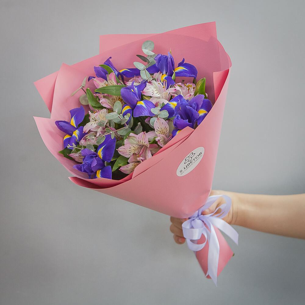 Альстромерия – 4 шт.Ирис – 6 шт.Эвкалипт – 1 шт.Матовая пленка – 1 шт.