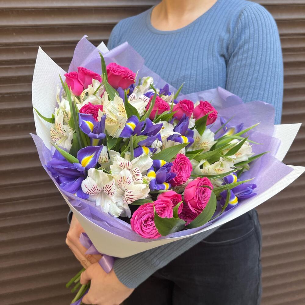 Альстромерия – 7 шт.Ирис – 10 шт.Зелень – 5 шт.Тишью – 2 шт.Пленка дизайнерская – 2 шт.классик сенсейшен – 3 шт.