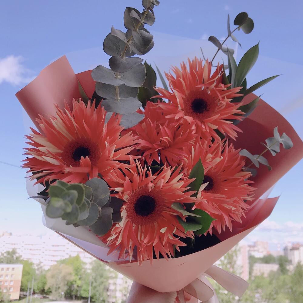 Рускус – 1 шт.Эвкалипт – 1 шт.Лента атласная – 1 шт.Упаковка дизайнерская – 1 шт.инструкция по уходу за цветами – 1 шт.любовь флориста – 1 шт.махровая гербера – 5 шт.витамины для цветов – 1 шт.