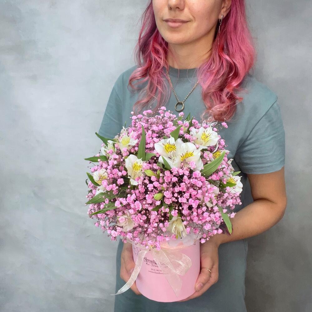 Альстромерия – 5 шт.Гипсофила розовая – 3 шт.Коробка d12 – 1 шт.Оазис – 1 шт.