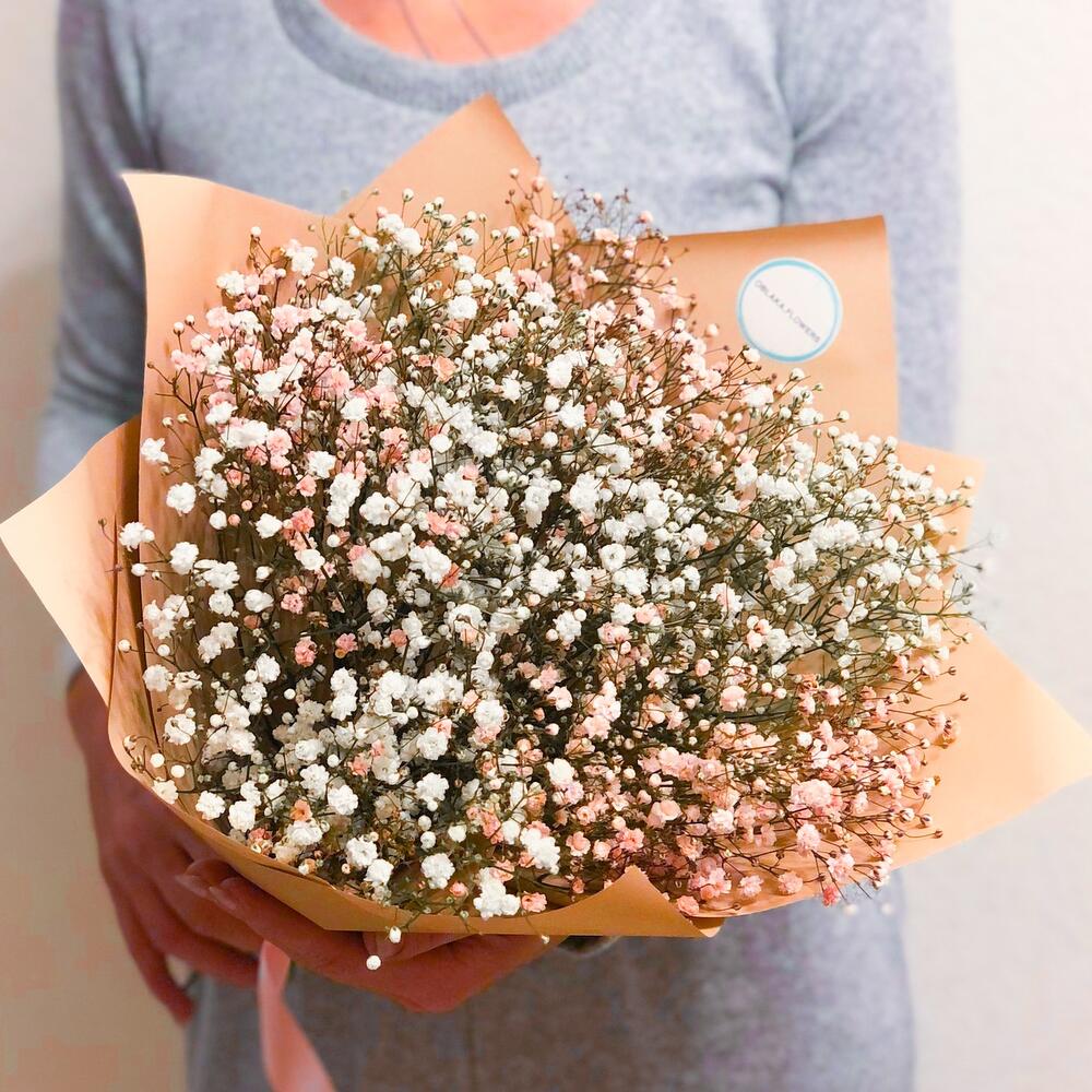 Гипсофила – 3 шт.гипсофила цветная – 4 шт.Пленка корейская – 2 шт.Лента атласная – 1 шт.