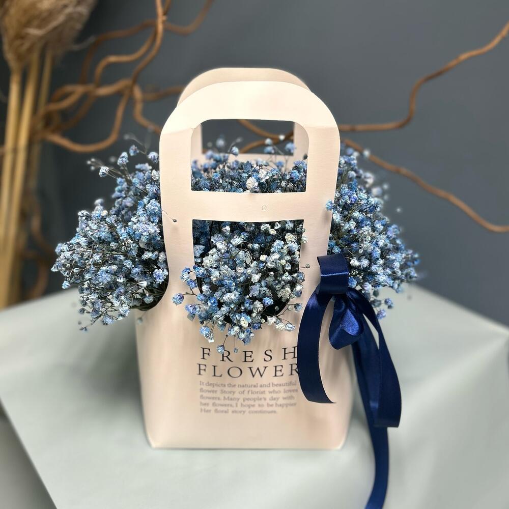 Гипсофила крашеная – 5 шт.Оазис флористический – 1 шт.Сумка крафт – 1 шт.Лента атласная – 1 шт.