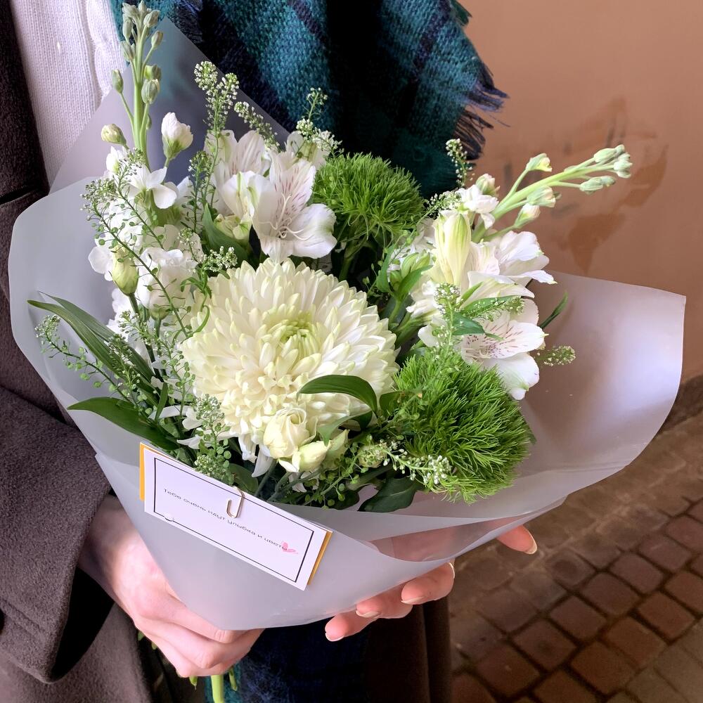 Маттиола – 2 шт.Диантус – 2 шт.Альстромерия белая – 2 шт.Лизиантус белый – 1 шт.Гринбелл – 1 шт.Рускус сочи – 4 шт.Хризантема белая одноголовая – 1 шт.Авторская упаковка – 1 шт.