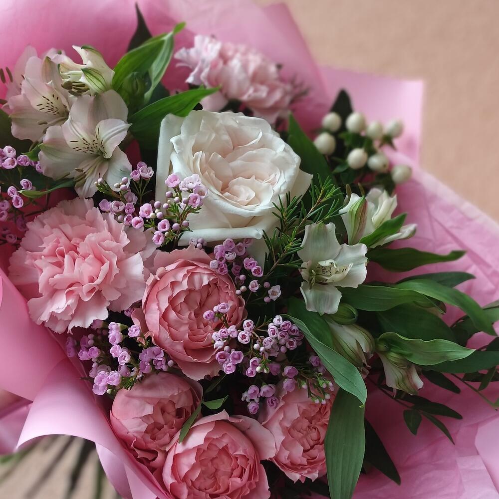 Роза пионовидная одноголовая – 1 шт.Роза кустовая пионовидная – 1 шт.Альстромерия – 2 шт.хамелациум розовый – 1 шт.Гиперикум – 1 шт.Гвоздика – 2 шт.Фисташка – 2 шт.Тишью – 1 шт.Упаковка дизайнерская – 1 шт.Лента атласная – 1 шт.