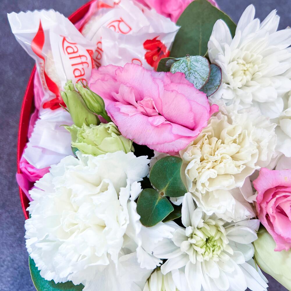 Лизиантус – 1 шт.Хризантема кустовая – 1 шт.Эвкалипт – 2 шт.Тишью – 1 шт.Диантус – 3 шт.Коробка сердце – 1 шт.Оазис флористический – 1 шт.конфеты раффаэлло – 7 шт.упаковка транспортировочная – 1 шт.