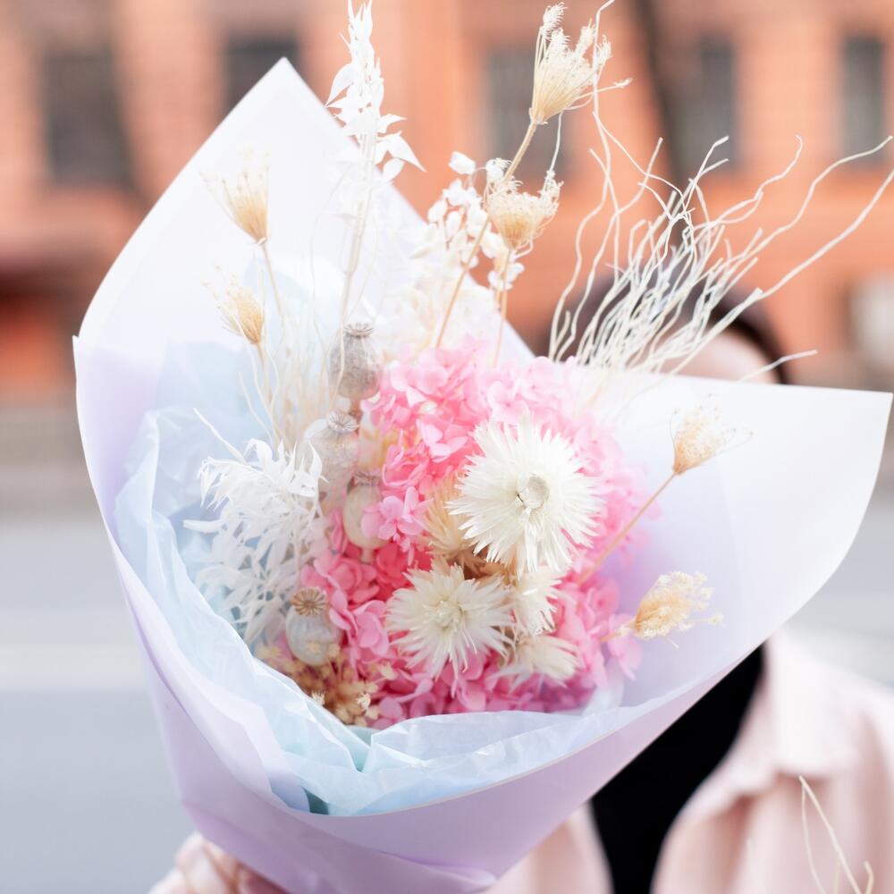 гортензия стабилизированная – 1 шт.Ковыль – 20 шт.Гелихризум – 7 шт.мак декоративный – 4 шт.рускус стабилизированный – 3 шт.Упаковка дизайнерская – 1 шт.