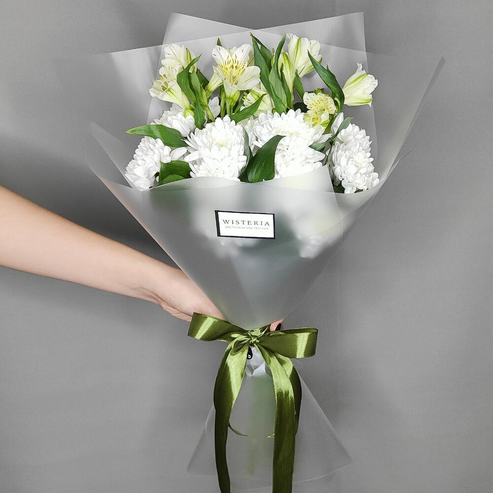 Альстромерия – 2 шт.Рускус – 3 шт.Хризантема кустовая – 2 шт.Лента атласная – 1 шт.Упаковка дизайнерская – 1 шт.