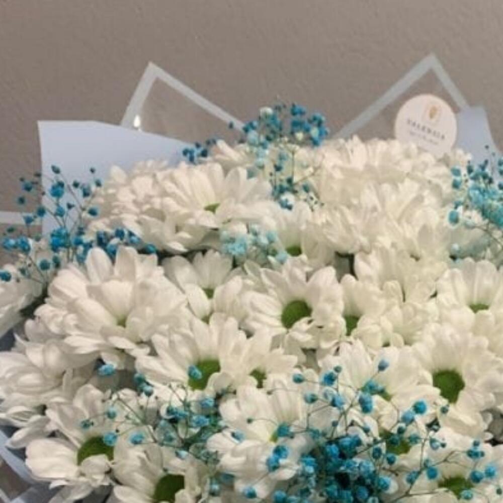 Хризантема кустовая – 25 шт.Гипсофила – 4 шт.Упаковка дизайнерская – 4 шт.