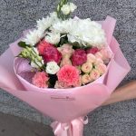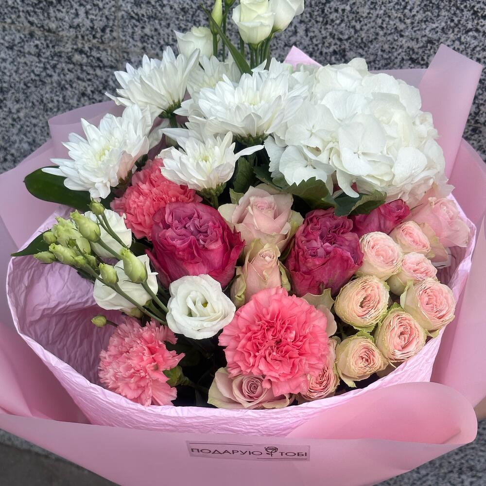 Альстромерии, Гвоздики, Кустовые розы, Лизиантусы, Розы, Хризантемы