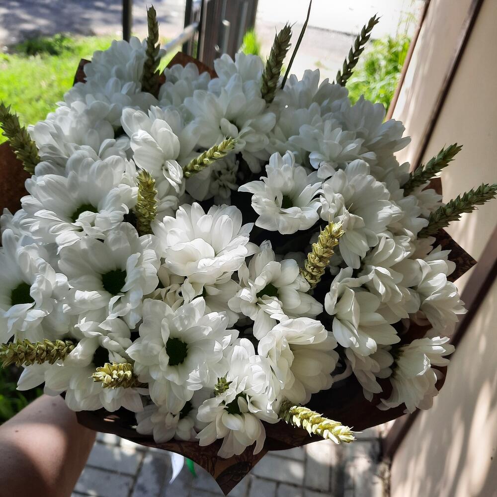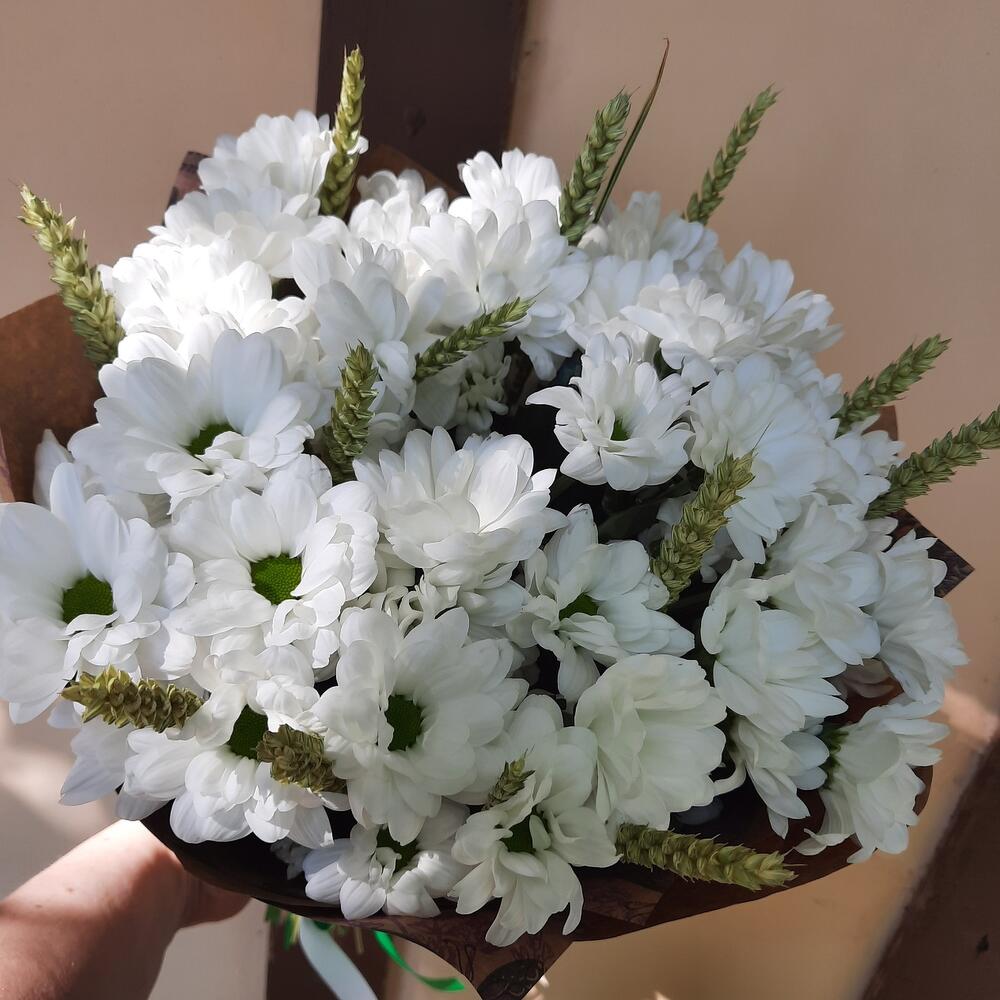 Хризантема кустовая – 7 шт.Колоски пшеницы – 16 шт.Упаковка дизайнерская – 1 шт.