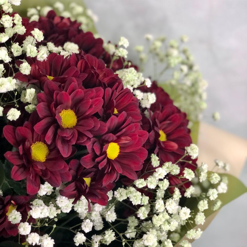 Хризантема кустовая красная – 5 шт.гипсофила радужная – 3 шт.Упаковка дизайнерская – 2 шт.