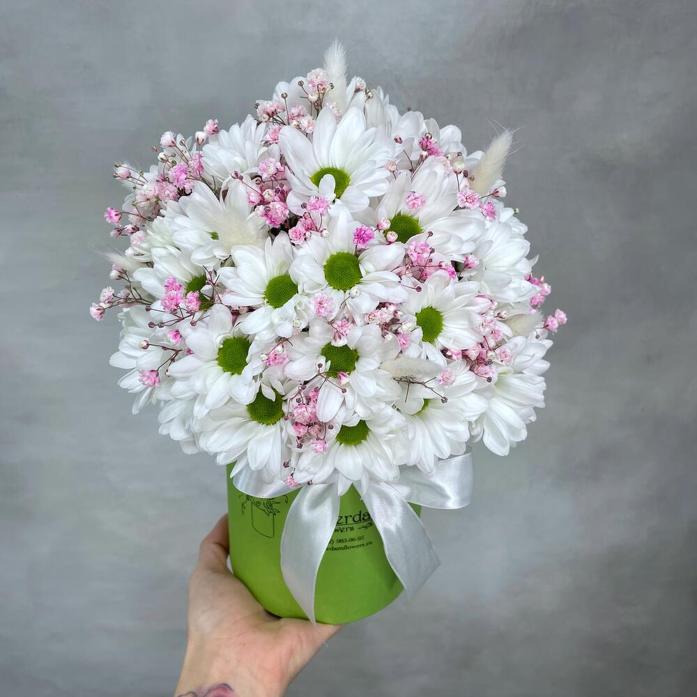 Оазис – 1 шт.Хризантема Бакарди – 5 шт.Коробка d12 – 1 шт.Гипсофила розовая – 3 шт.Лагурус (сухоцвет) – 11 шт.