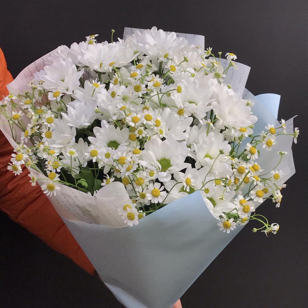 Хризантема кустовая – 5 шт.Матрикария (Ромашка Камила) – 15 шт.бумага дизайнерская – 1 шт.Лента атласная – 1 шт.
