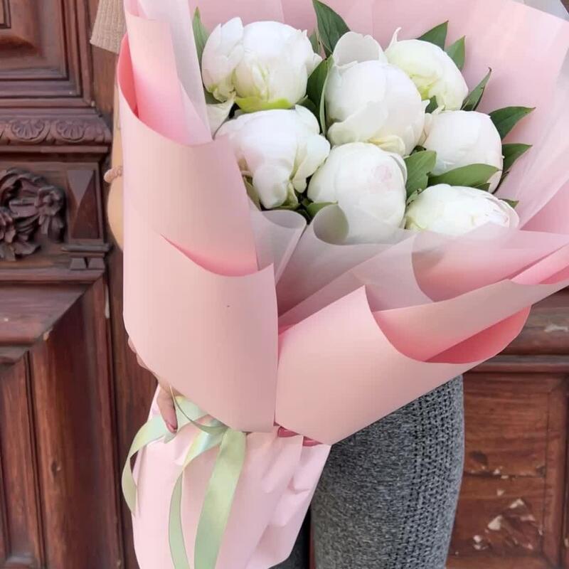 Лента атласная – 2 шт.Пленка матовая – 5 шт.пион мадам клод тейн – 7 шт.пленка полупрозрачная – 4 шт.
