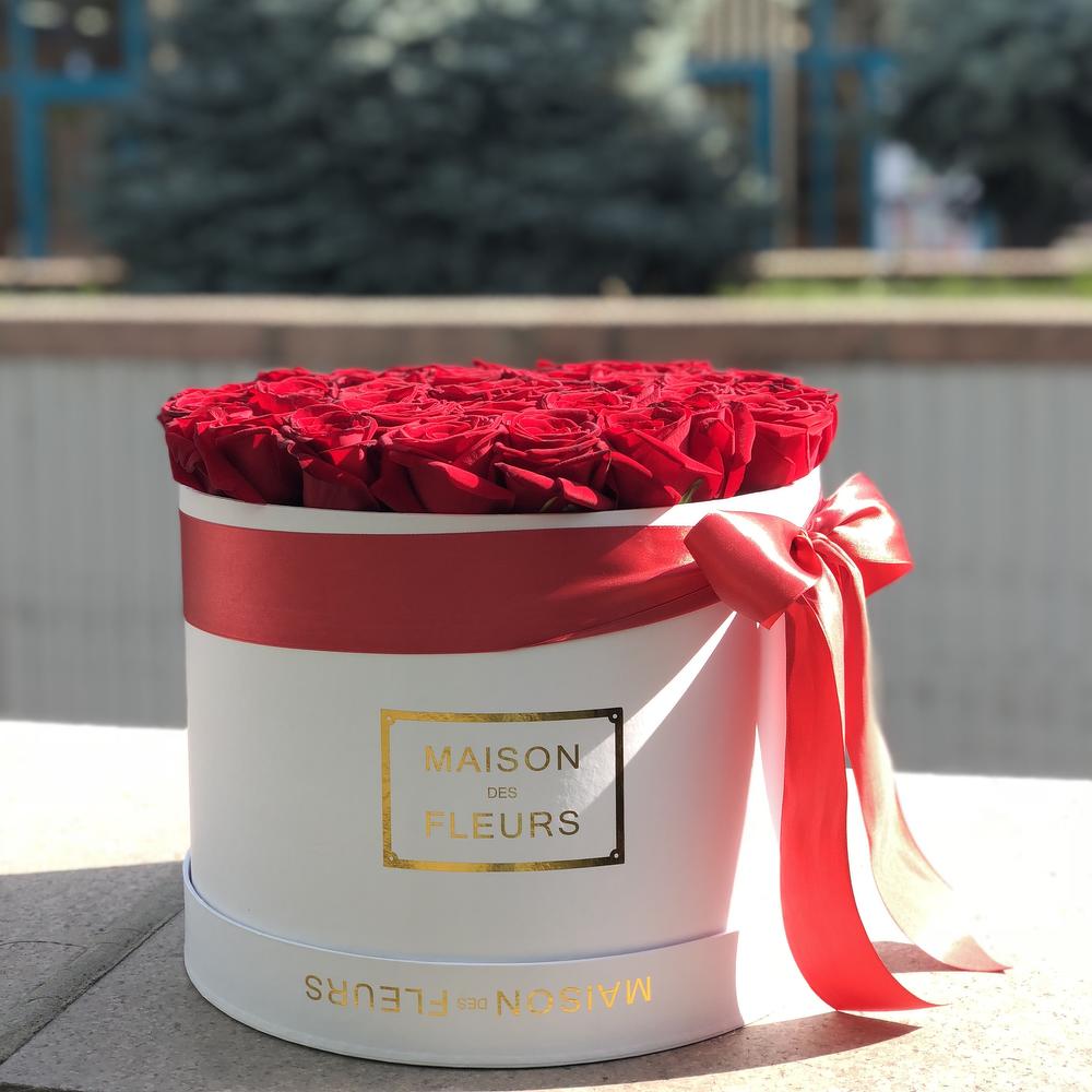 Прекрасная классическая композиция из Красных роз в белой фирменной Коробке, перевязанная шелковой лентой.