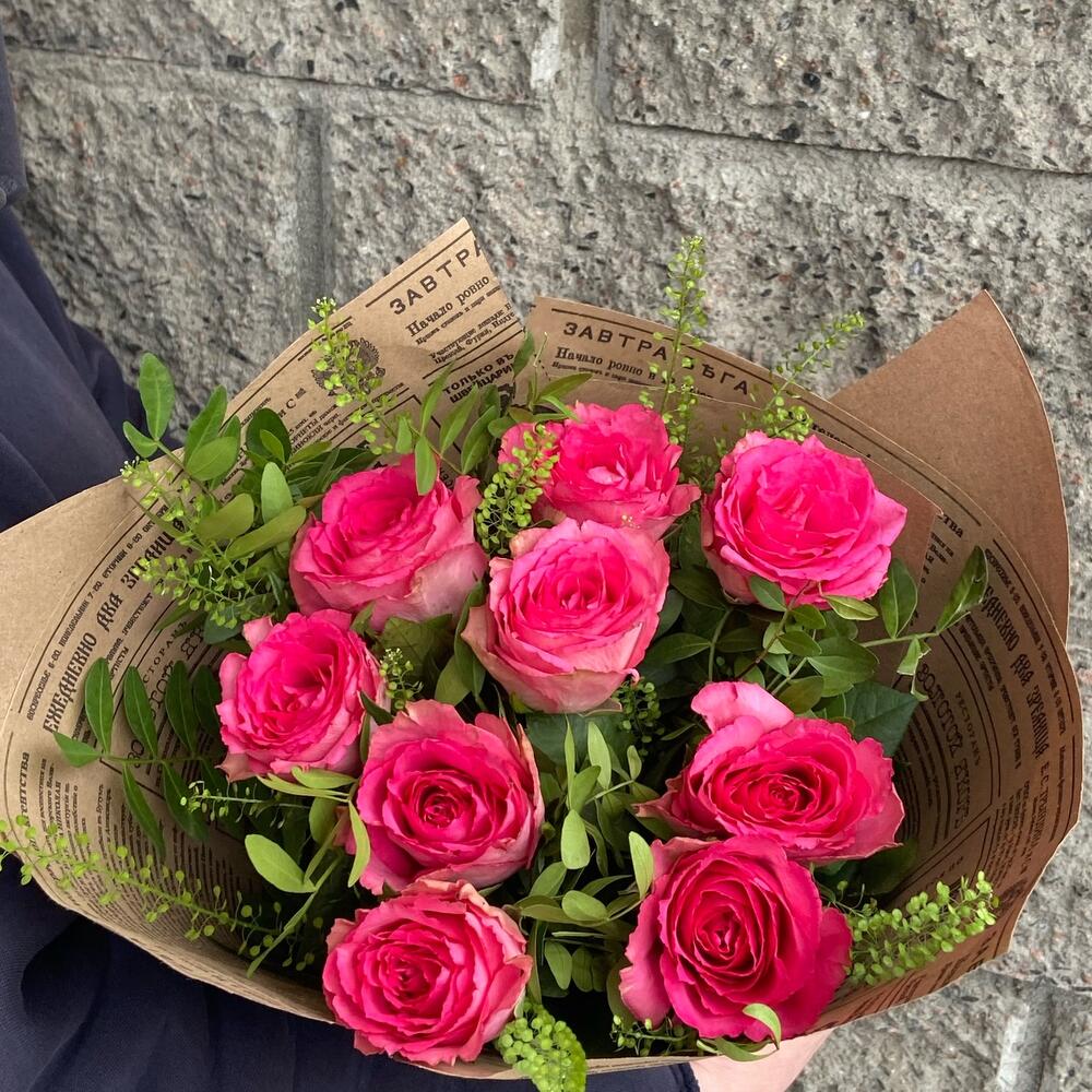 Роза 50 см – 9 шт.Фисташка – 4 шт.Пастушья сумка – 1 шт.Крафт упаковка – 1 шт.