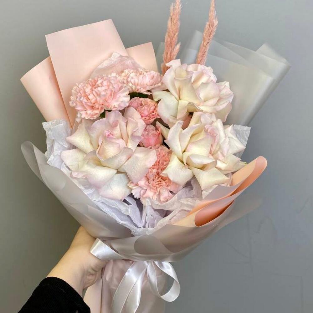 Гвоздики, Кустовые розы, Пионовидные розы, Розы