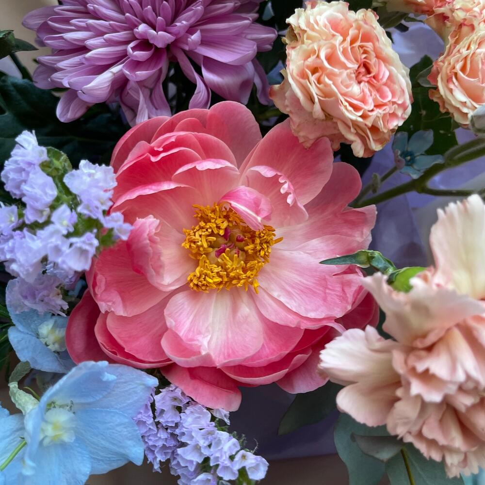 Дельфиниум – 2 шт.Пион – 1 шт.Статица – 1 шт.Эвкалипт – 3 шт.Диантус – 6 шт.Роза пионовидная кустовая – 1 шт.Фисташка – 1 шт.Хризантема одноголовая – 2 шт.Твидия – 1 шт.