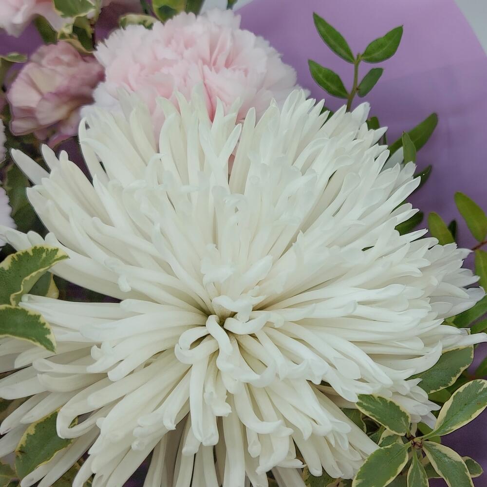 Хризантема одноголовая – 1 шт.Роза кустовая – 1 шт.гвоздика сортовая (диантус) – 5 шт.Гвоздика кустовая – 2 шт.зелень питтоспорум – 1 шт.зелень пистация – 2 шт.Упаковка пленка матовая – 3 шт.Лента атласная – 2 шт.
