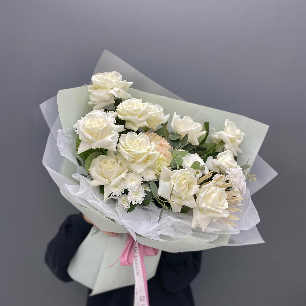 Альстромерии, Гвоздики, Кустовые розы, Лизиантусы, Розы, Хризантемы