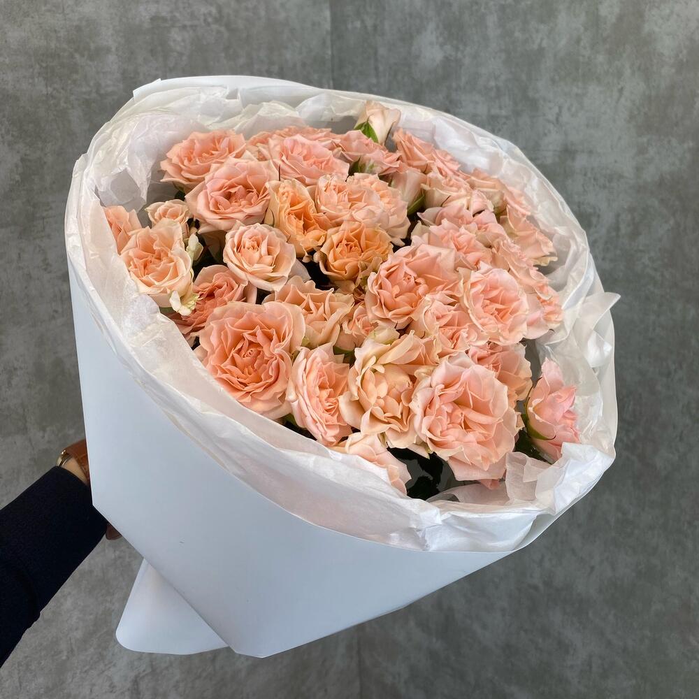 Кустовая роза – 21 шт.Упаковка – 2 шт.Атласная лента – 1 шт.