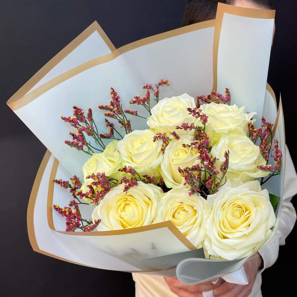 Белая роза 50 см – 9 шт.Лимониум – 1 шт.Упаковка дизайнерская – 1 шт.Лента атласная – 1 шт.