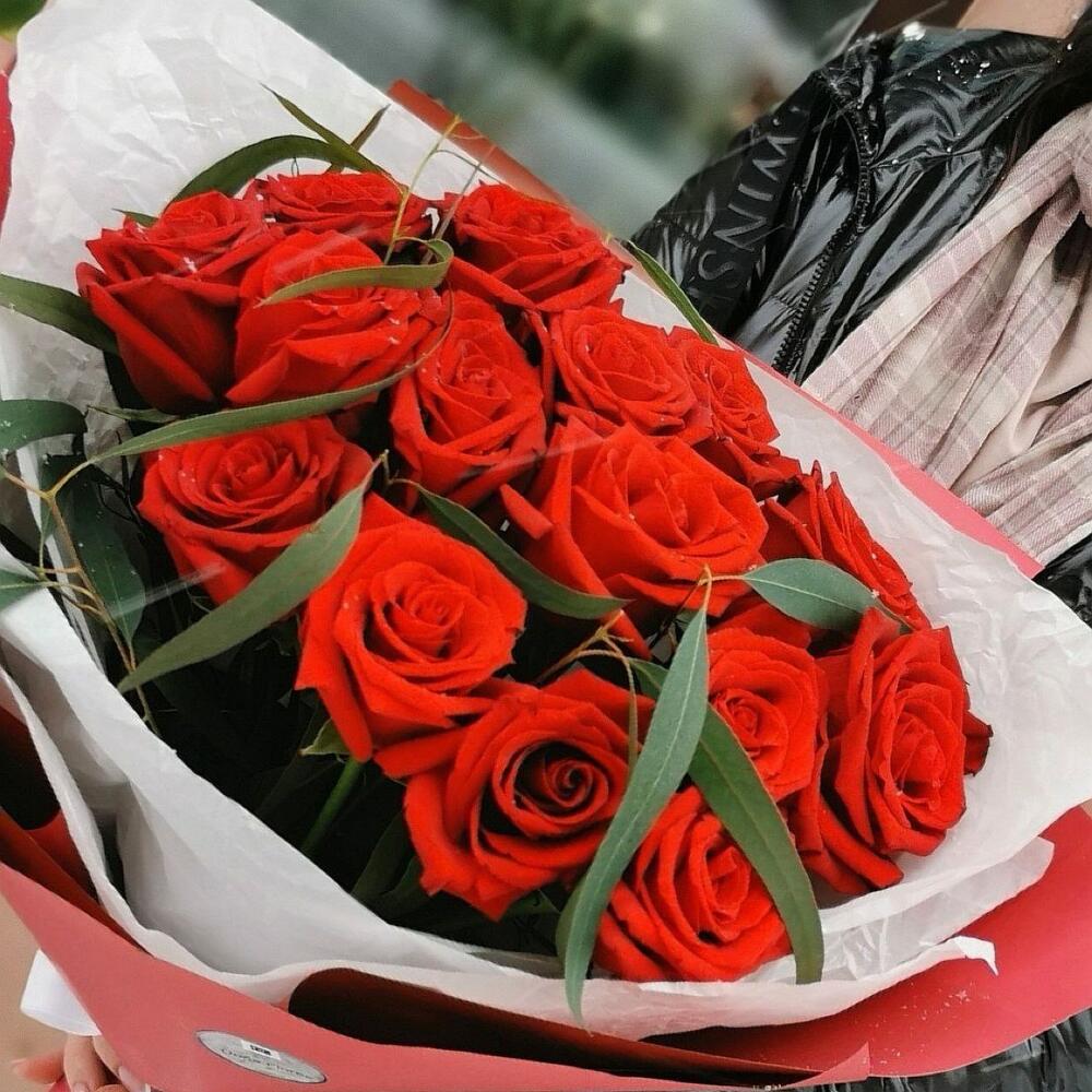 Роза Эквадор – 15 шт.Эвкалипт – 3 шт.Упаковка дизайнерская – 3 шт.Тишью – 2 шт.