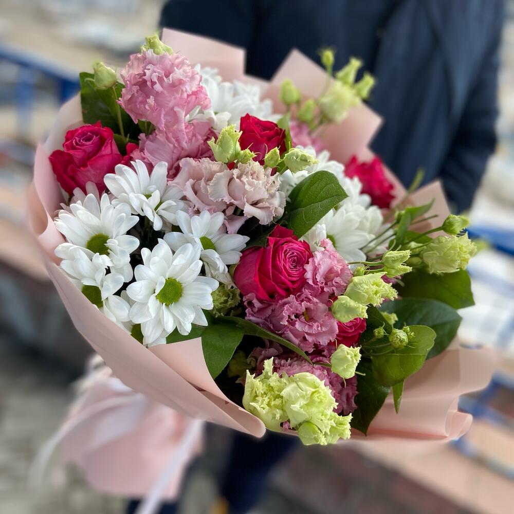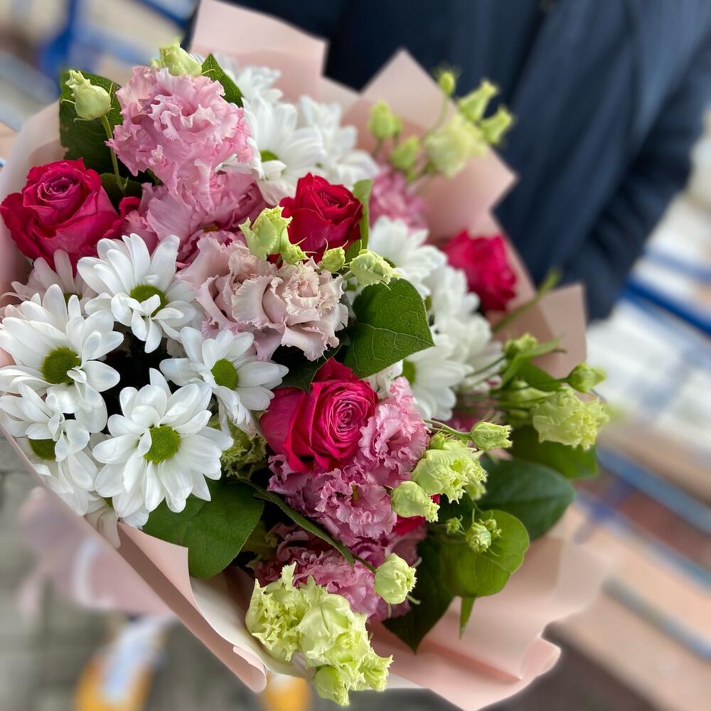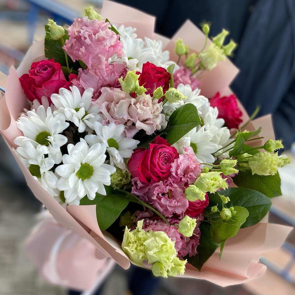Букет из роз, хризантемы и махровой эустомы