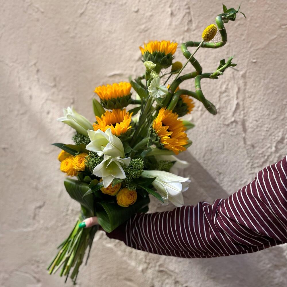 Аспидистра – 5 шт.роза кустовая луна трендсеттер – 4 шт.Скиммия – 6 шт.лилия лонгифлорум – 3 шт.Бамбук – 3 шт.Краспедия – 2 шт.гвоздика соломио – 2 шт.Подсолнух – 5 шт.