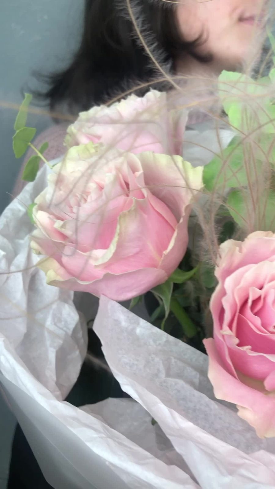 Эвкалипт – 2 шт.Упаковка дизайнерская – 2 шт.Ковыль – 1 шт.пинк мондиаль роза – 7 шт.