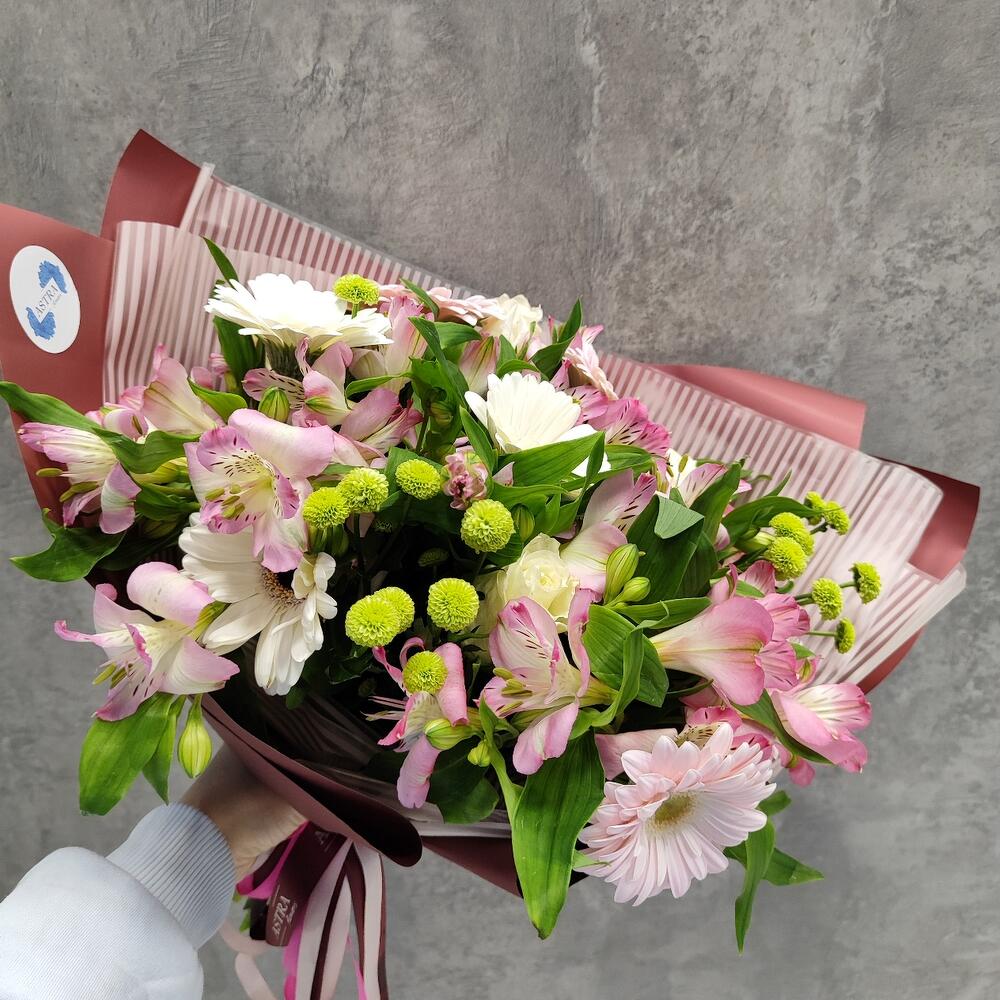 Альстромерия – 7 шт.Гербера – 6 шт.Роза – 3 шт.хризантема кустовая помпон – 3 шт.Авторская упаковка – 1 шт.Атласная лента – 1 шт.