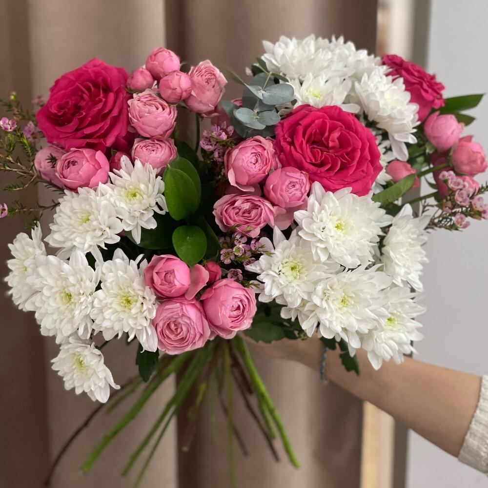 Роза – 3 шт.Эвкалипт – 2 шт.Хризантема – 3 шт.Роза кустовая – 5 шт.Рускус – 3 шт.васфлаувер – 2 шт.