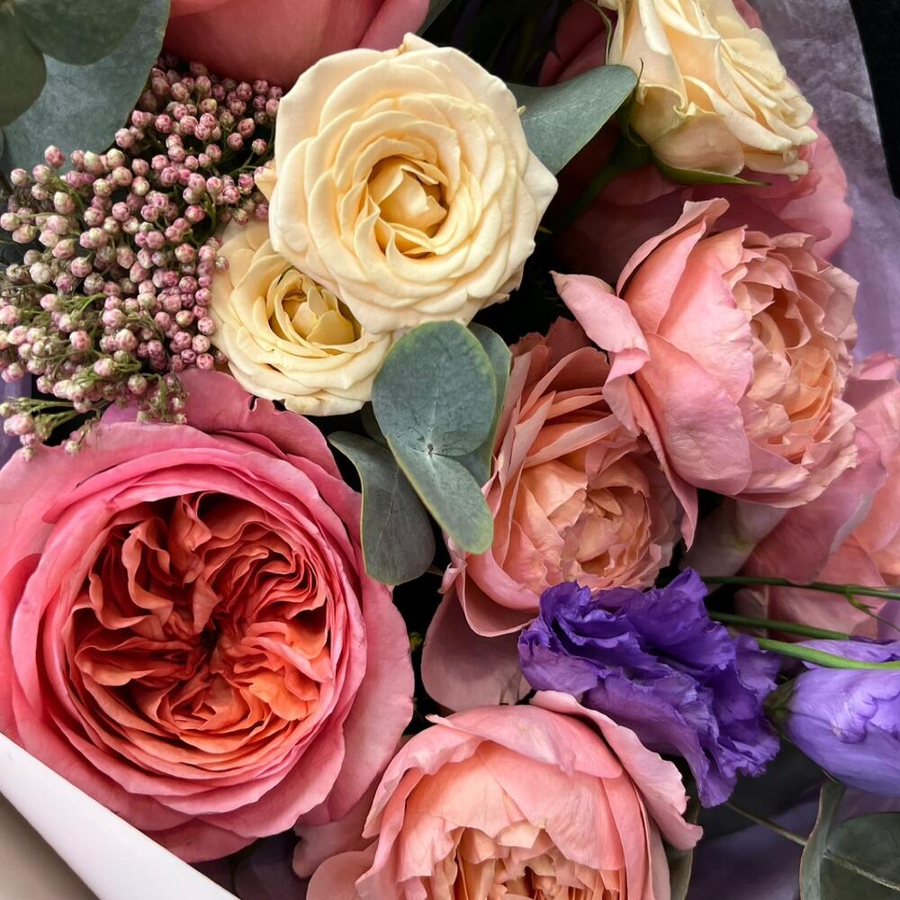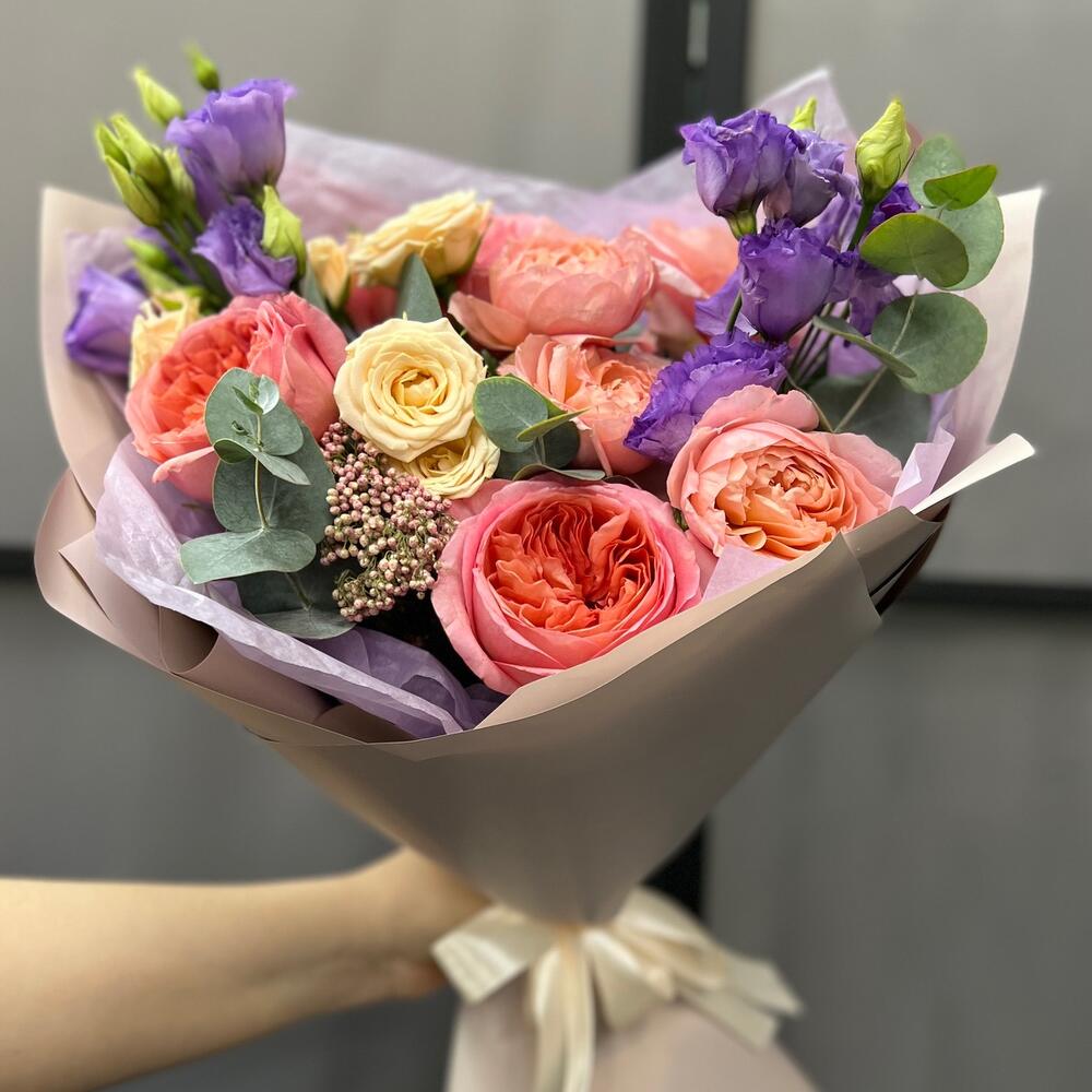 роза кустовая таня – 1 шт.Роза кустовая пионовидная джульетта – 1 шт.роза пионовидная пинк экспрешн – 3 шт.эустома лавандовая – 2 шт.Озотамнус – 1 шт.Эвкалипт – 2 шт.Тишью – 2 шт.Пленка матовая – 3 шт.Лента атласная – 2 шт.