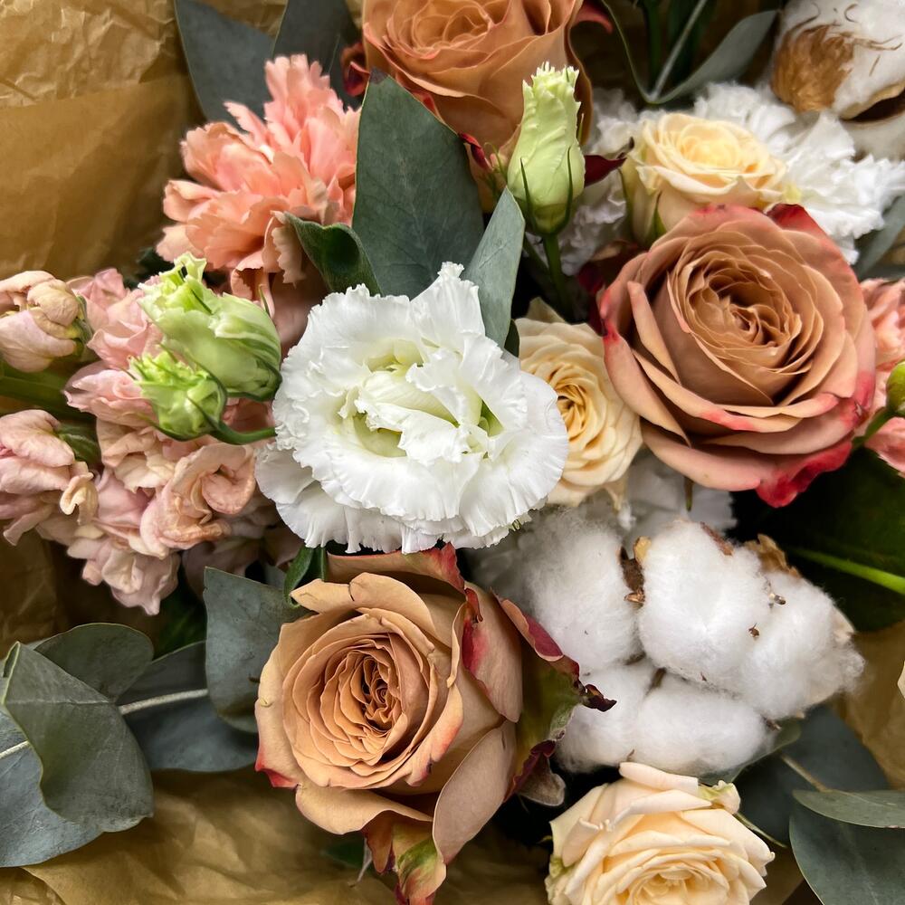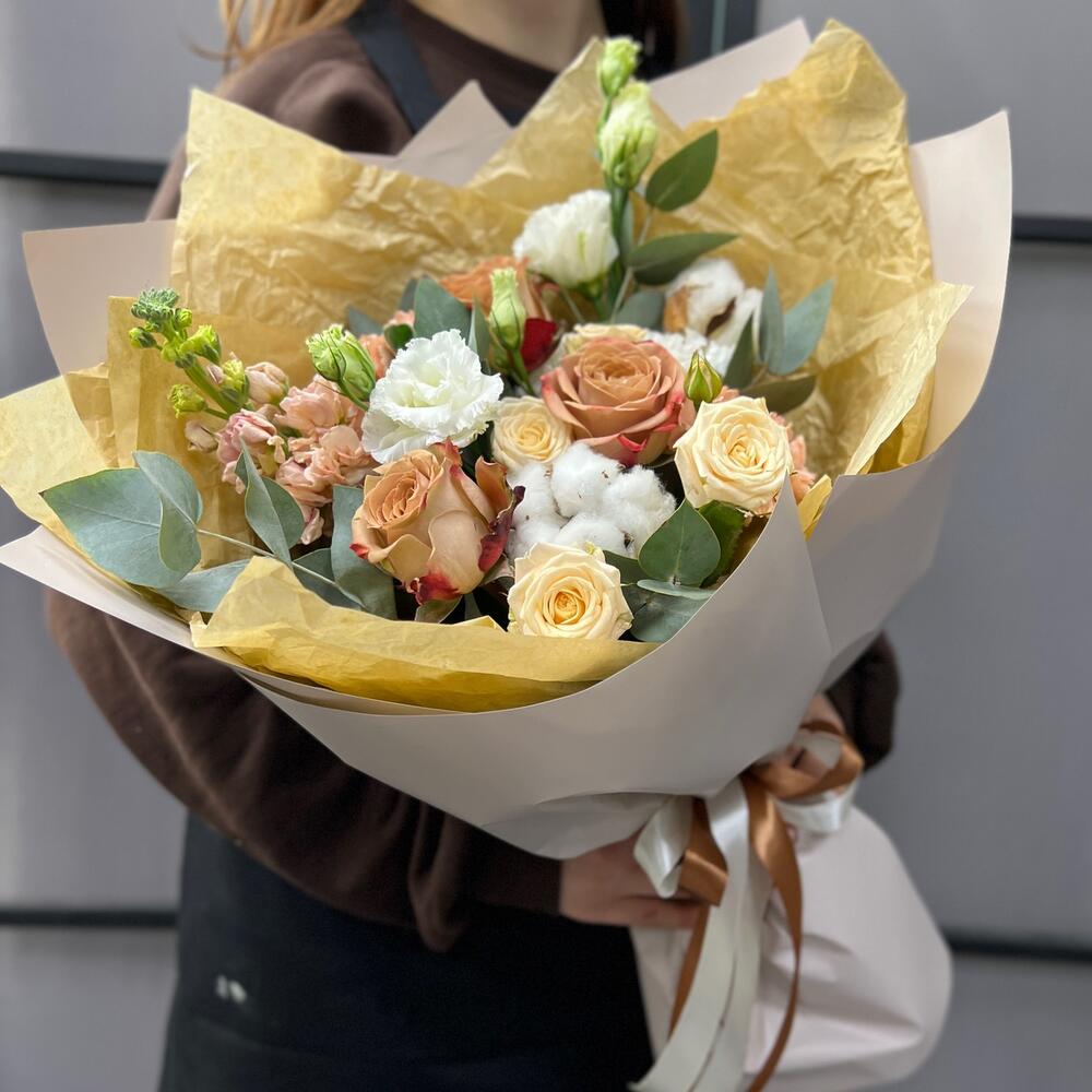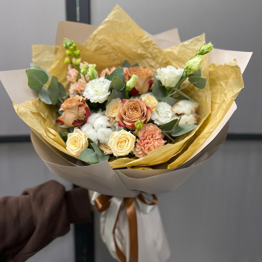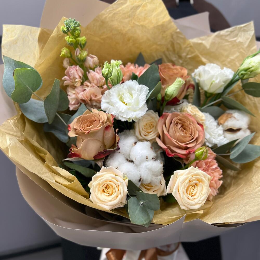 Маттиола априкот – 1 шт.капучино роза – 3 шт.роза кустовая таня – 1 шт.Хлопок – 2 шт.эустома махровая белая – 1 шт.Эвкалипт – 3 шт.Диантус – 3 шт.Тишью – 2 шт.Пленка матовая – 5 шт.Лента атласная – 2 шт.
