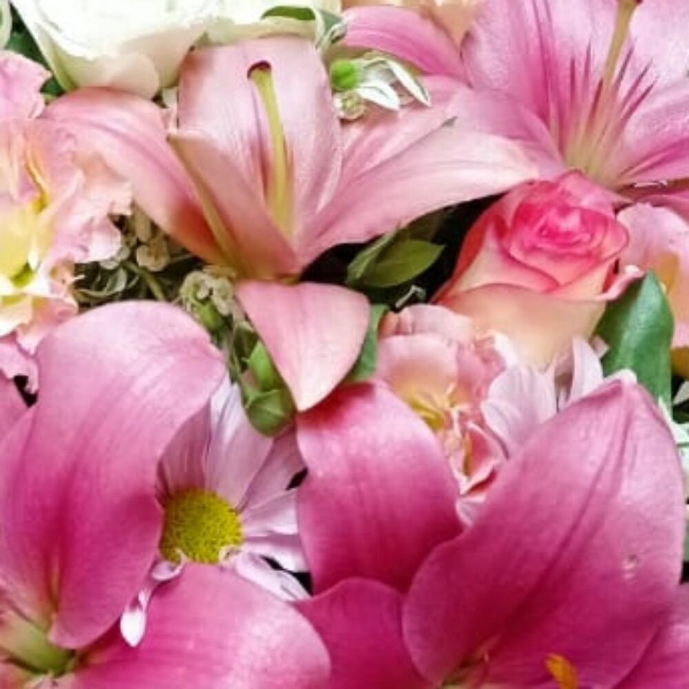 Лилия розовая – 1 шт. Роза Джумилия – 3 шт. Львиный зев розовый – 4 шт. Лизиантус Алиса белый – 3 шт. Хризантема кустовая – 1 шт.