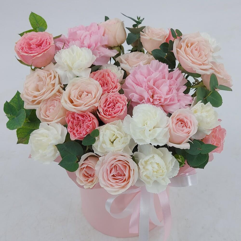 Нежные кустовые розочки, диантусы и эвкалипт в коробке. Такой презент всегда уместен и подойдёт для любого повода: День Рождения, именины, годовщина свадьбы, рождение ребенка, 8 марта, День Святого Валентина, выпускной и т.д. Можно вручить маме, сестре, подруге, коллеге, учителю, любимой.