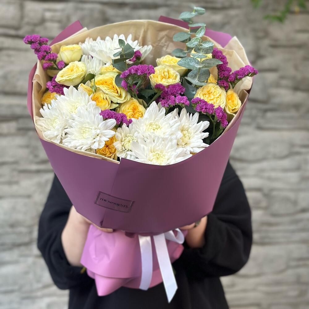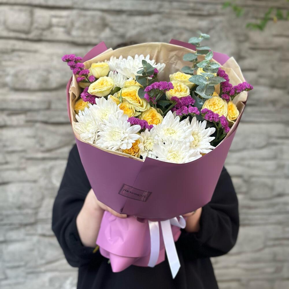 Альстромерии, Кустовые розы, Лизиантусы, Пионовидные розы, Розы, Ромашки