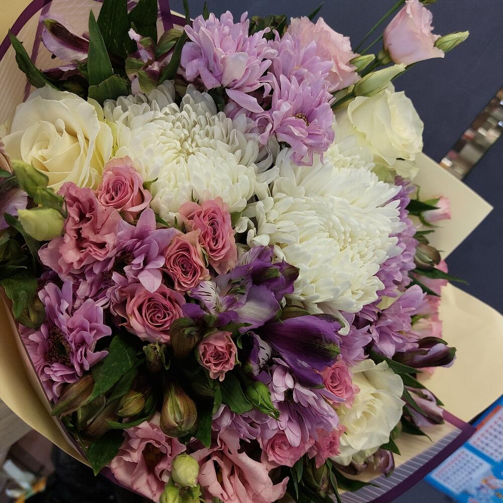 Кустовая роза – 4 шт.Роза – 5 шт.Эустома – 4 шт.Хризантема кустовая – 5 шт.Хризантема одноголовая белая – 3 шт.Альстромерия – 6 шт.Упаковка дизайнерская – 4 шт.Лента атласная – 2 шт.