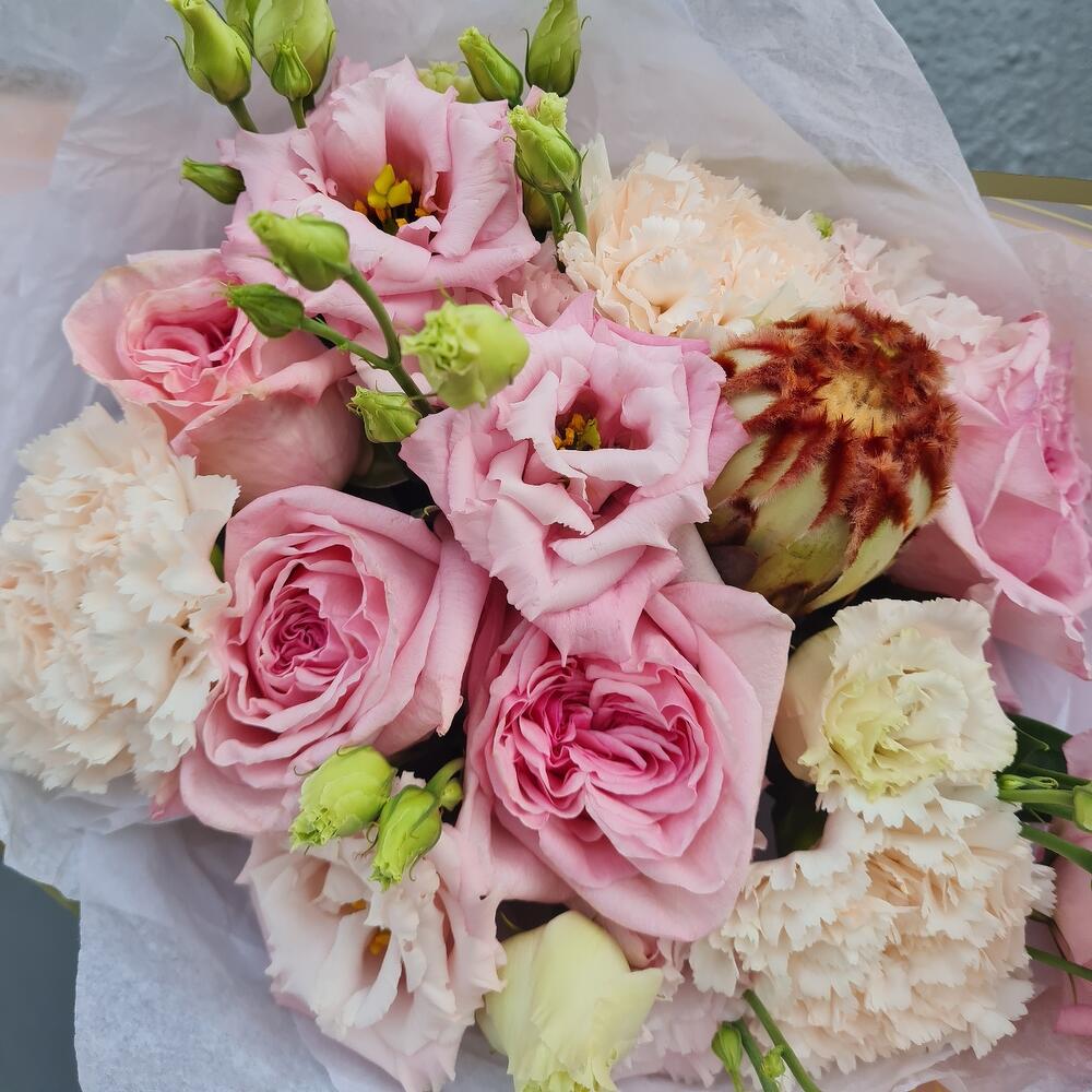 Протея – 1 шт.эустома махровая – 3 шт.Роза pink o’hara – 5 шт.Диантус сортовой – 3 шт.