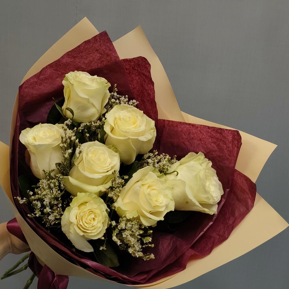 Роза Эквадор белая – 7 шт.Лимониум – 3 шт.Тишью – 2 шт.Пленка матовая – 1 шт.