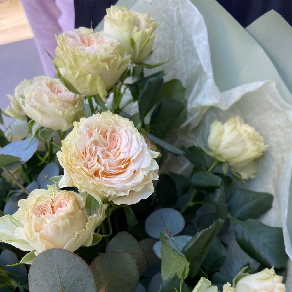 Эвкалипт – 3 шт.Лента атласная – 1 шт.Роза кустовая пионовидная – 7 шт.Упаковка дизайнерская – 6 шт.
