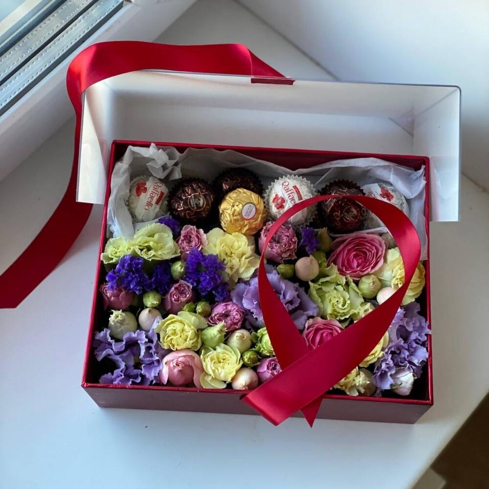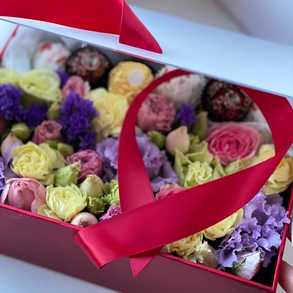 “Сладкое сердце ” – цветочная композиция с сладостями в коробке “Сердце”