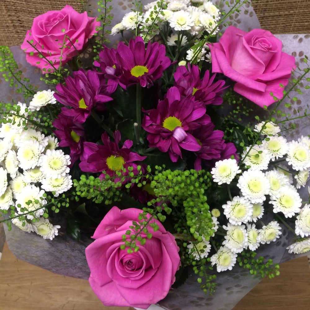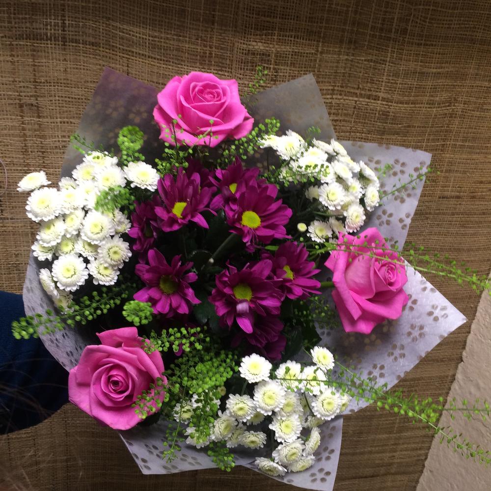 Роза – 3 шт.Хризантема кустовая – 4 шт.зелень декоративная – 19 шт.Упаковка – 2 шт.Лента атласная – 2 шт.