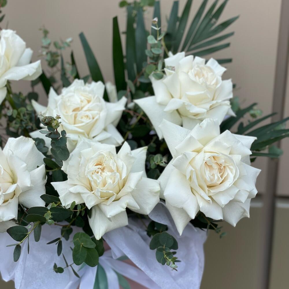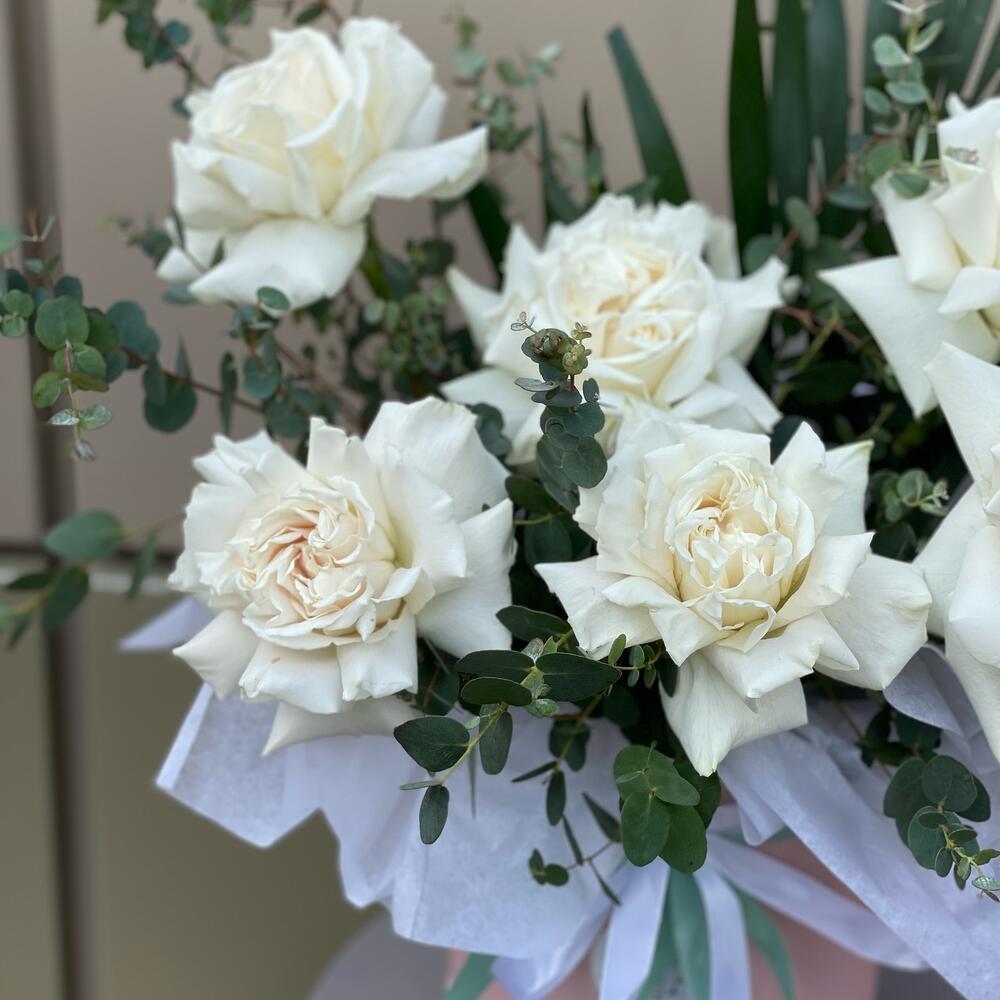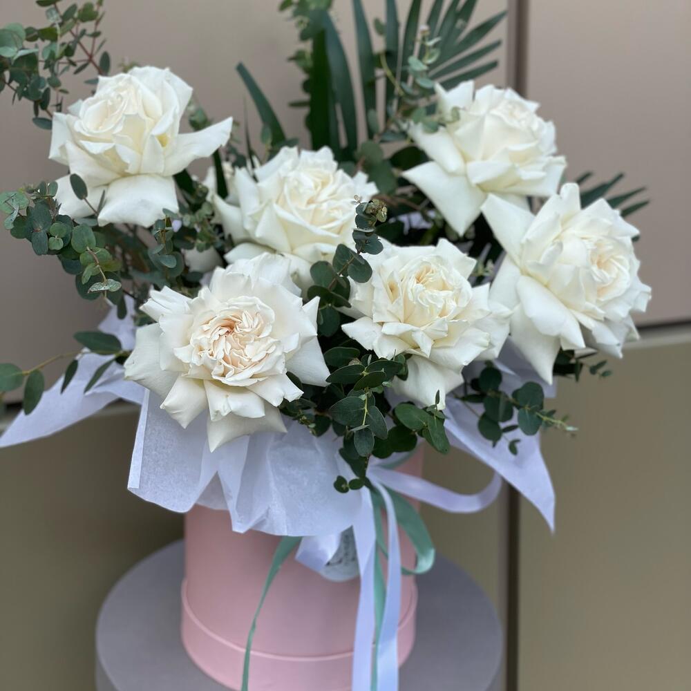 Роскошная коробка с белыми розами и зеленью Воздушная,нежная композиция с большим количеством зелени и белыми сортовыми розами