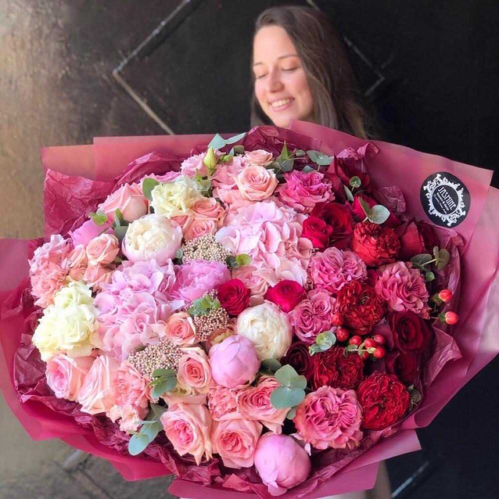 Альстромерии, Гортензии, Кустовые розы, Лизиантусы, Розы, Хризантемы