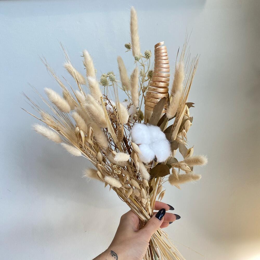 Лагурус – 50 шт.Колосья – 10 шт.Хлопок – 2 шт.эрингиум сухоцвет – 2 шт.овес сухоцвет – 5 шт.Эвкалипт сухоцвет – 1 шт.