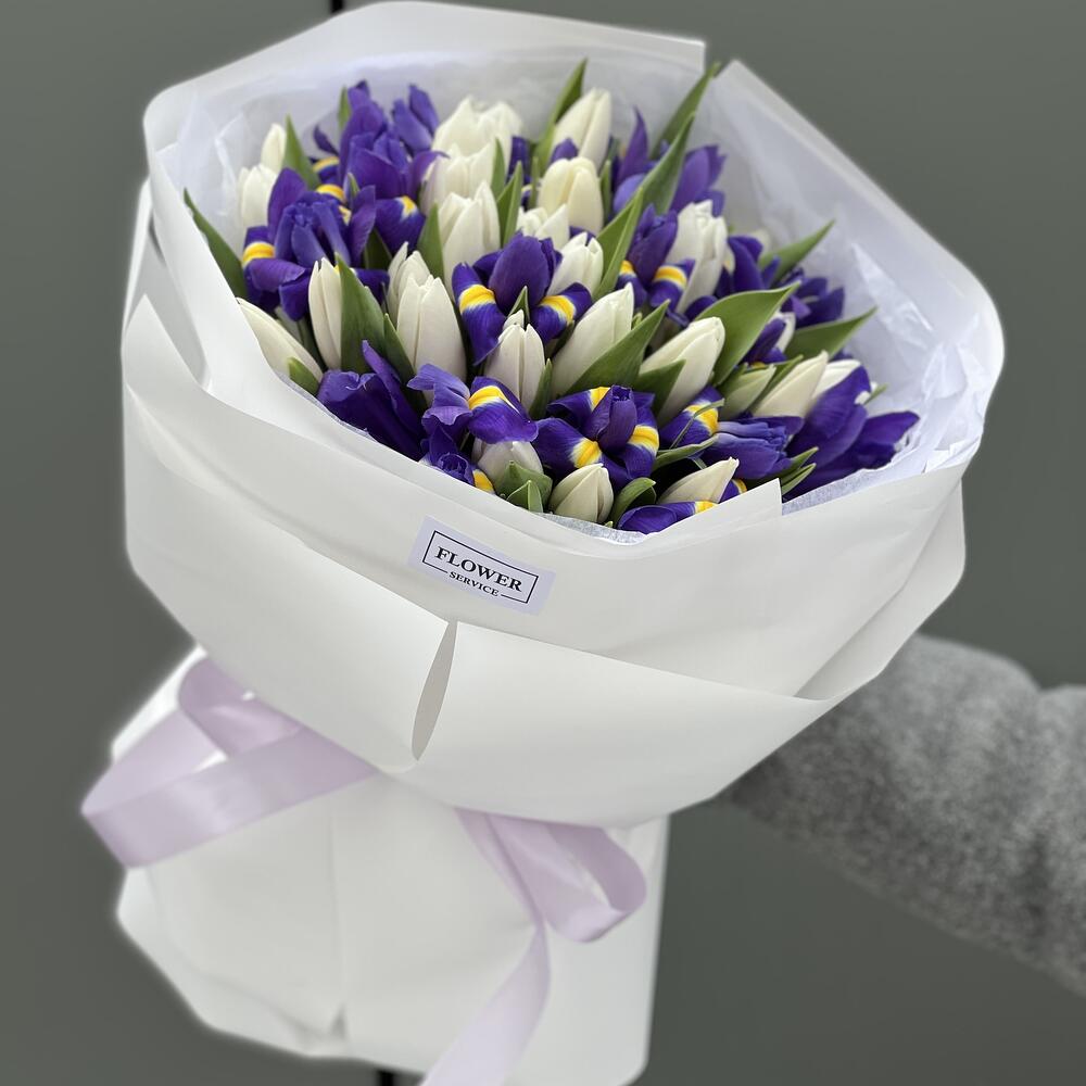 Тюльпан белый – 31 шт. ирисы – 15 шт. Писташ – 5 шт. Оформление – 1 шт.